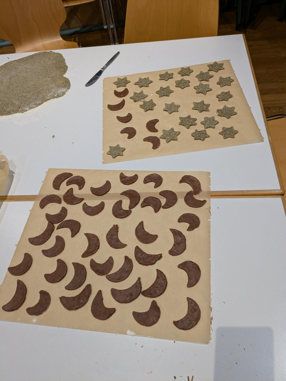 Ende November wurden dann sehr fleißig Plätzchen gebacken, die an der Friedenskirchweih zugunsten der Wärmestube Nürnberg und der Kirchengemeinde Eckenhaid verkauft werden. Über 250 Plätzchen in fünf Sorten waren es am Schluss, zwei Sorten davon zusammengeklebt und in Schokolade getaucht. Es war viel Arbeit und die Ausdauer der Plätzchenbäckerinnen war wirklich beeindruckend.